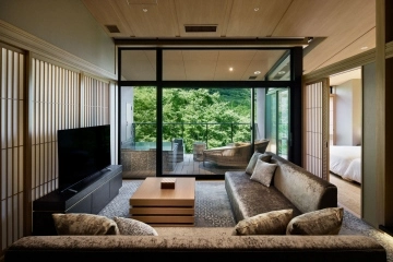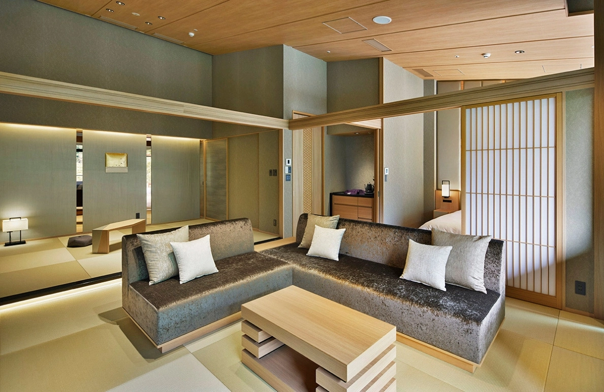 パール × 桜色の壁面と白木の調和が、華やかさと気品ある和を表現した客室です。